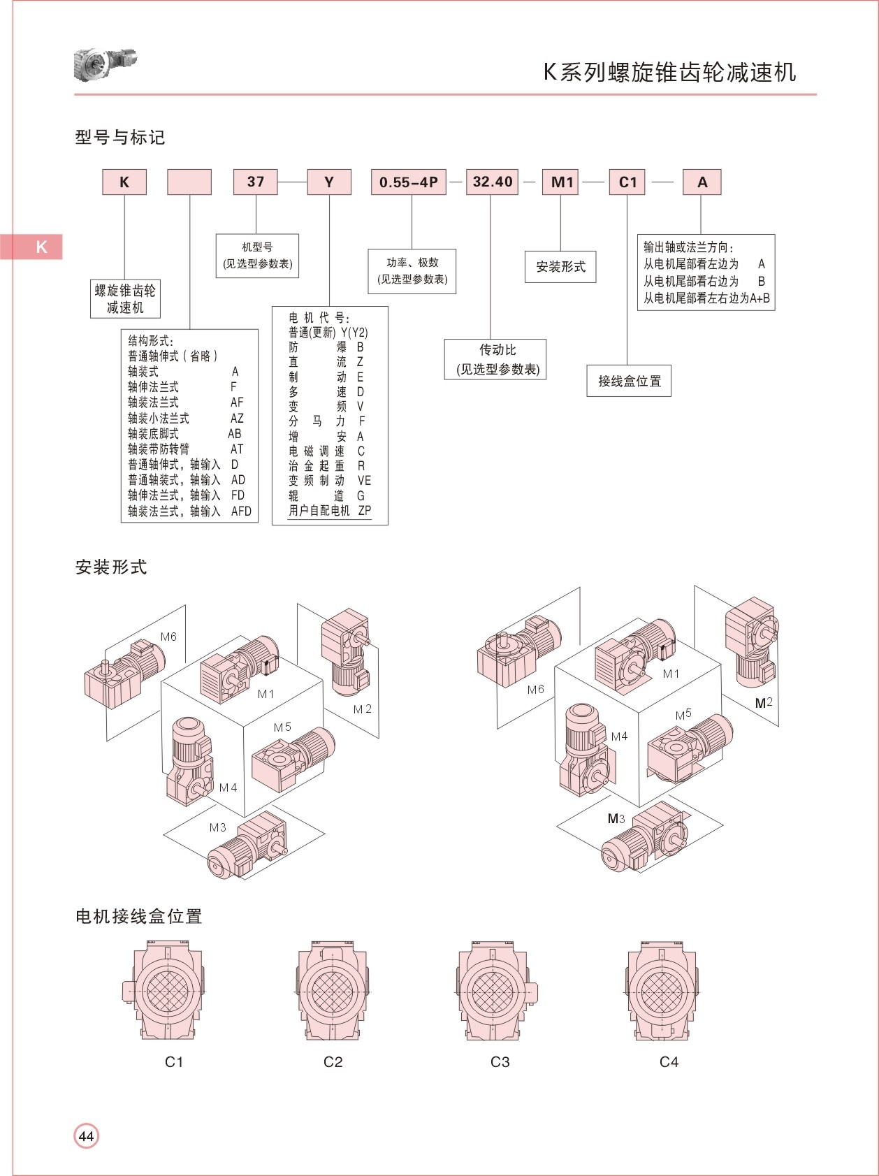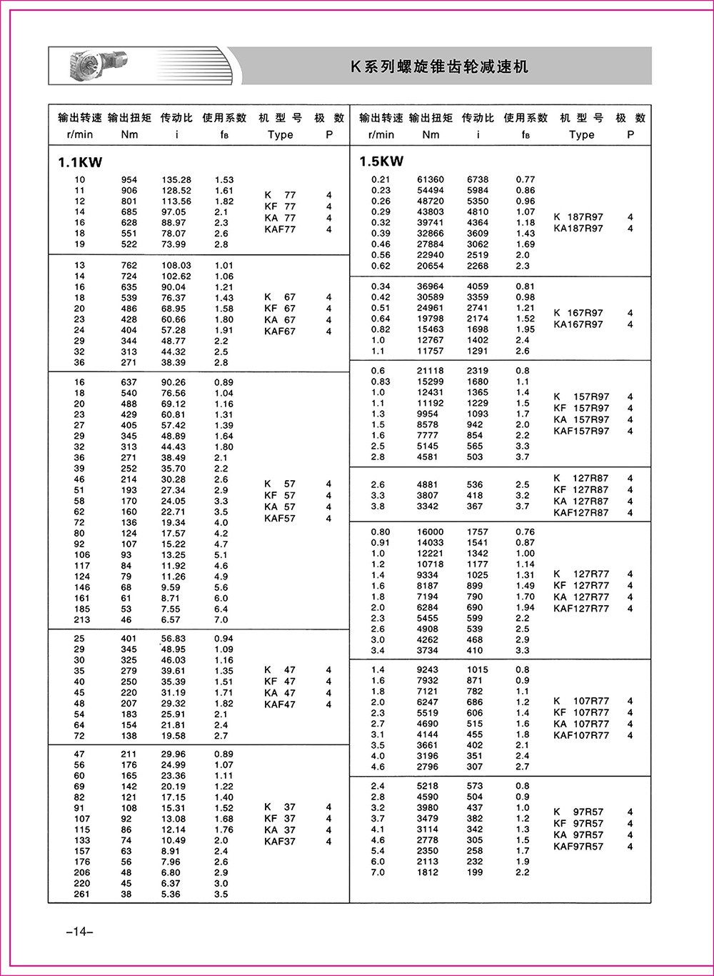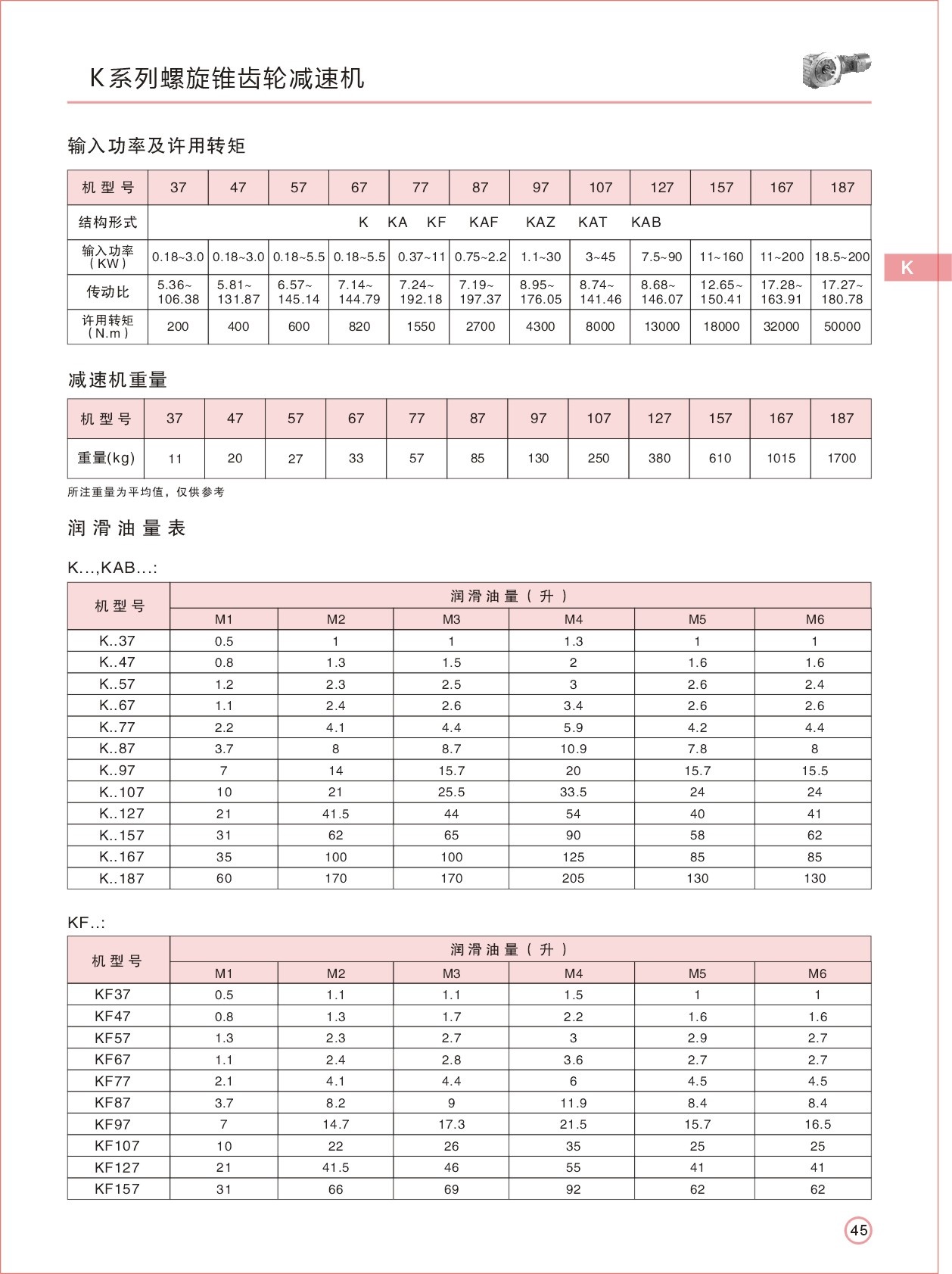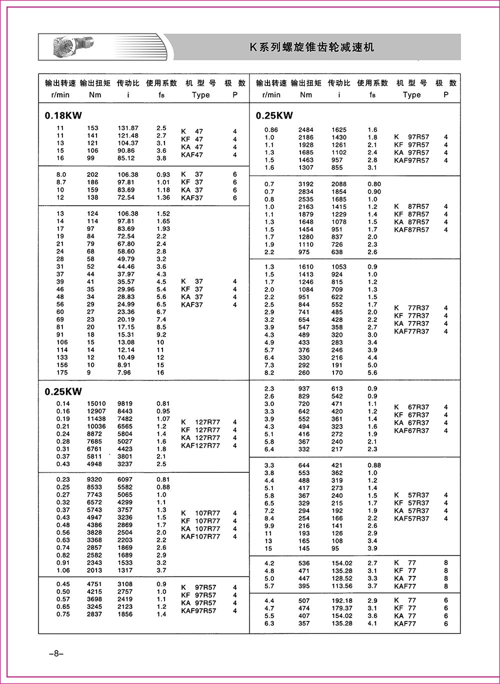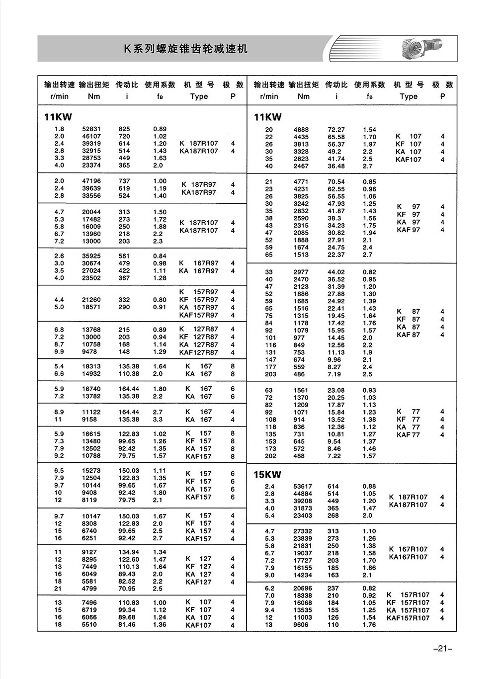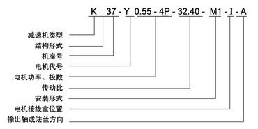 結(jié)構(gòu)形式:K-軸伸式、底腳安裝;KA-軸裝式聯(lián)接;KF-軸伸式、法蘭安裝;KAF-軸裝式、法蘭安裝;S-表示軸輸入。