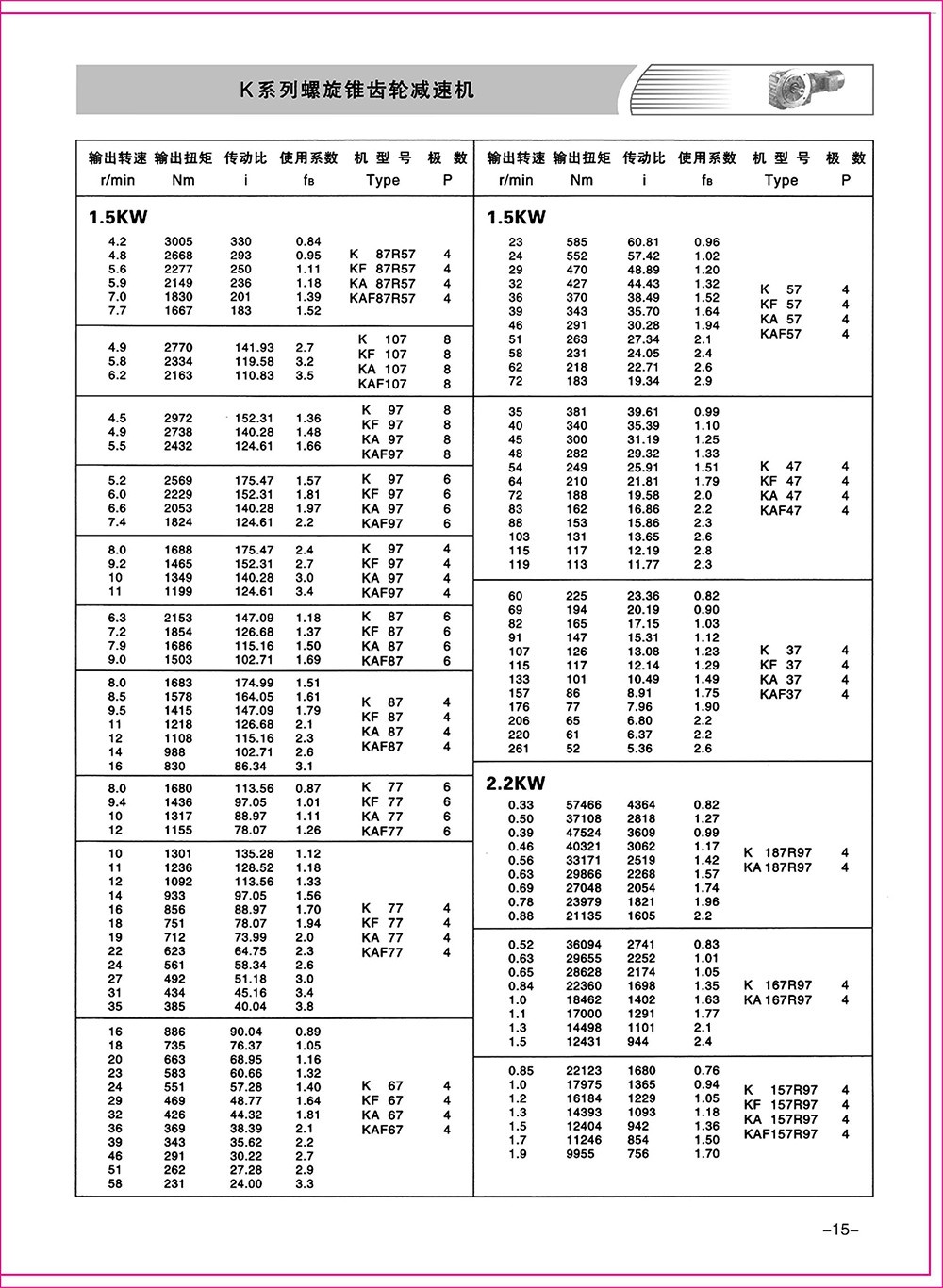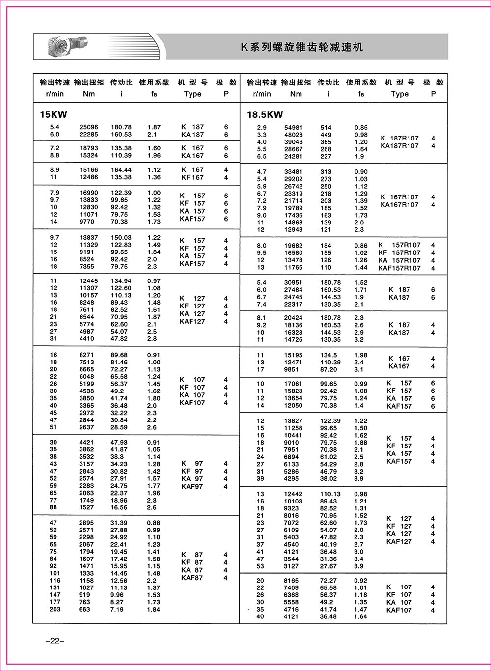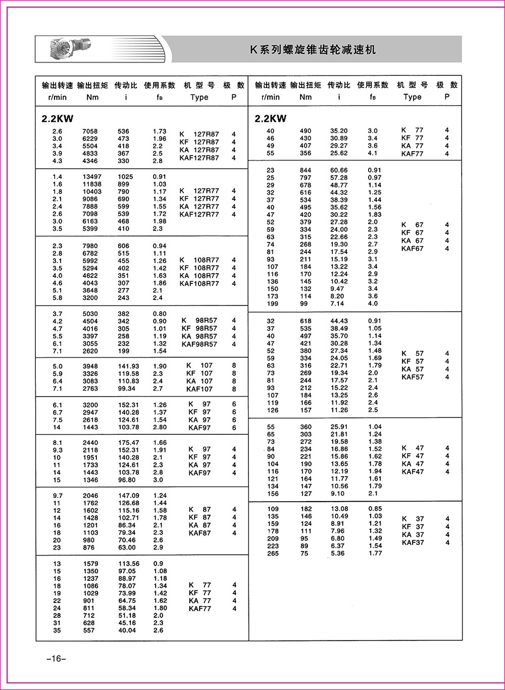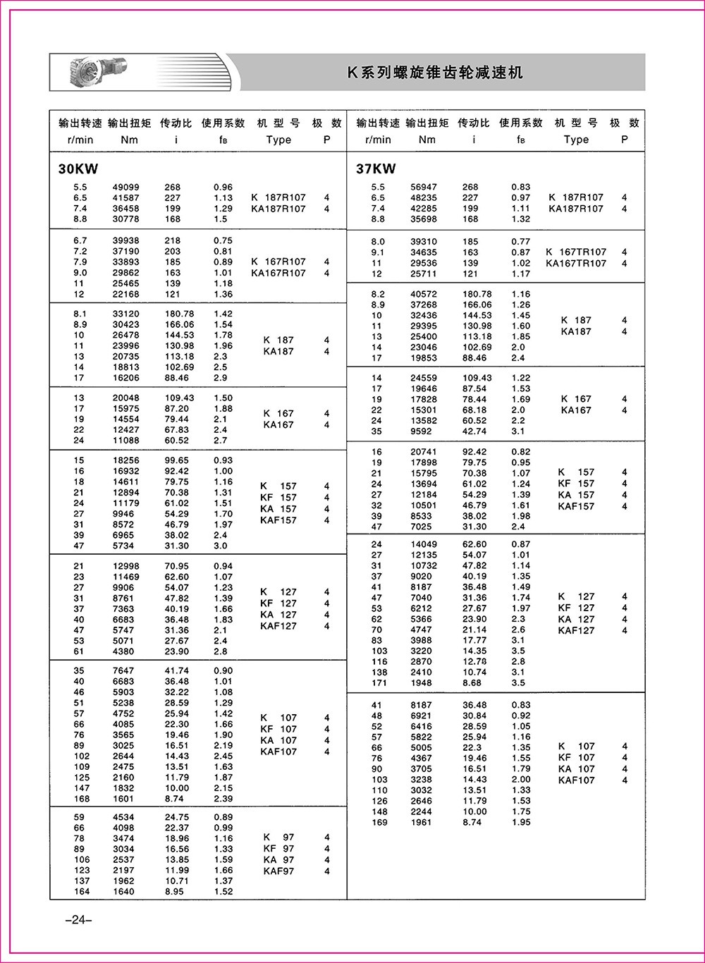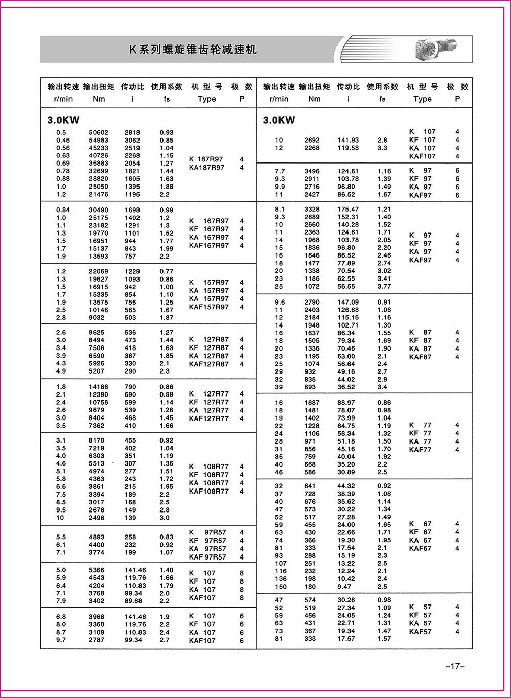 結(jié)構(gòu)形式:K-軸伸式、底腳安裝;KA-軸裝式聯(lián)接;KF-軸伸式、法蘭安裝;KAF-軸裝式、法蘭安裝;S-表示軸輸入。