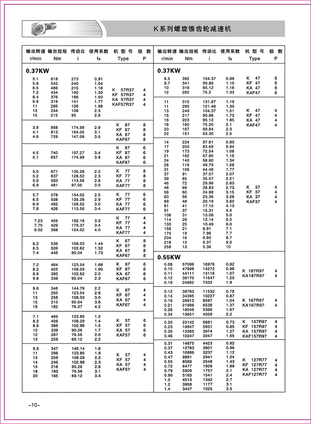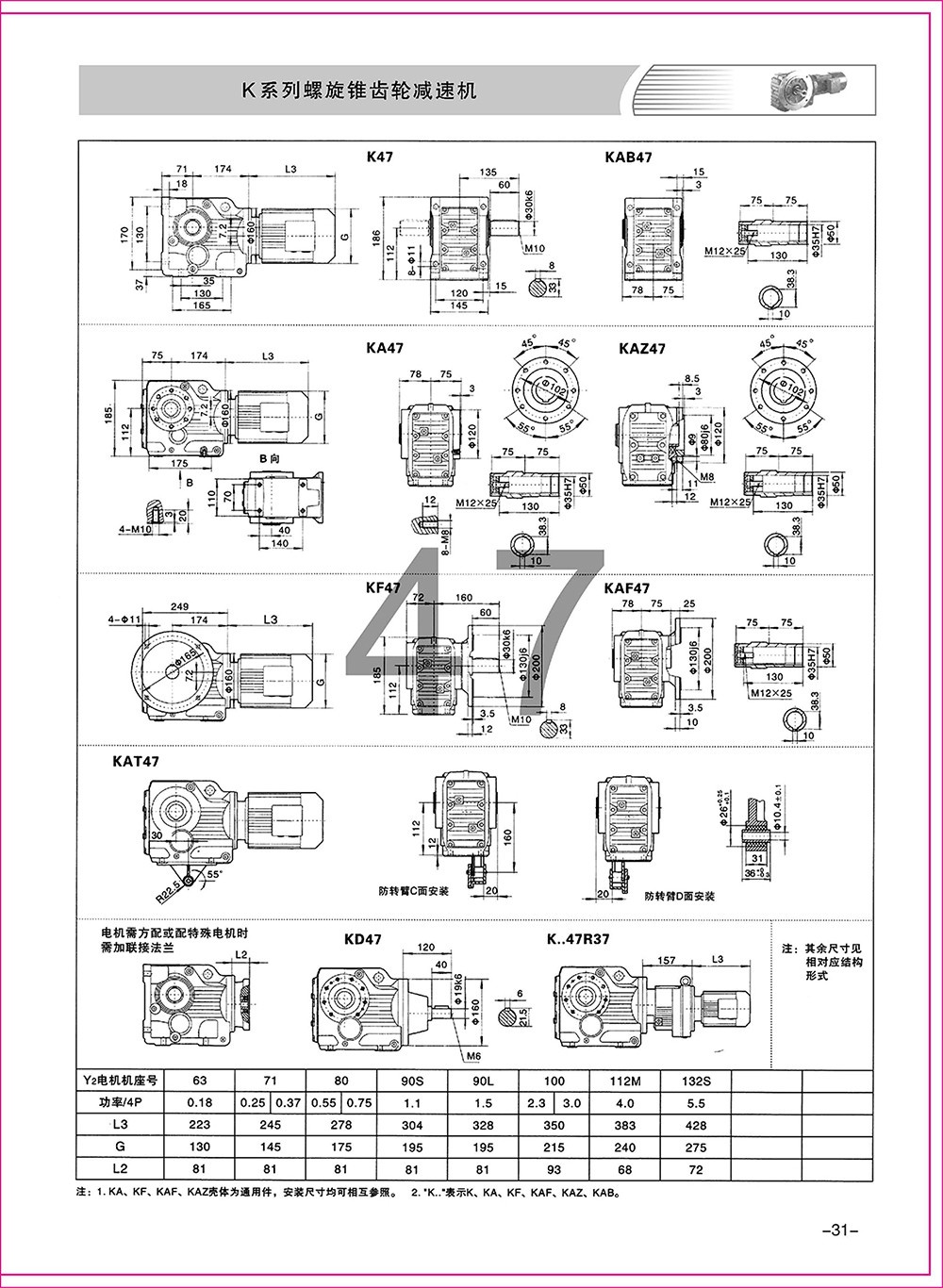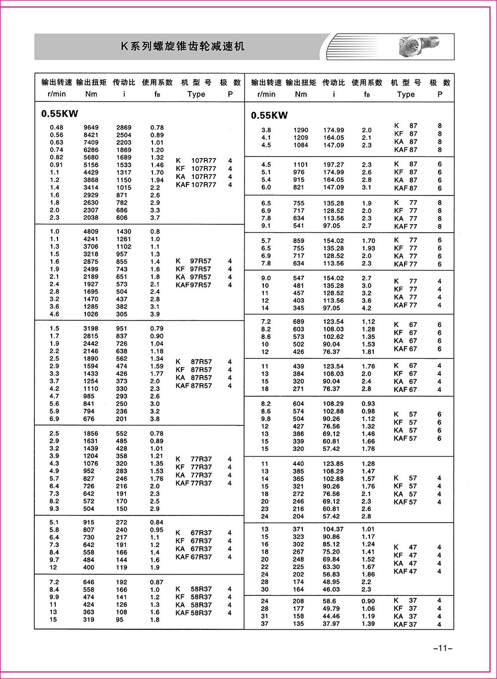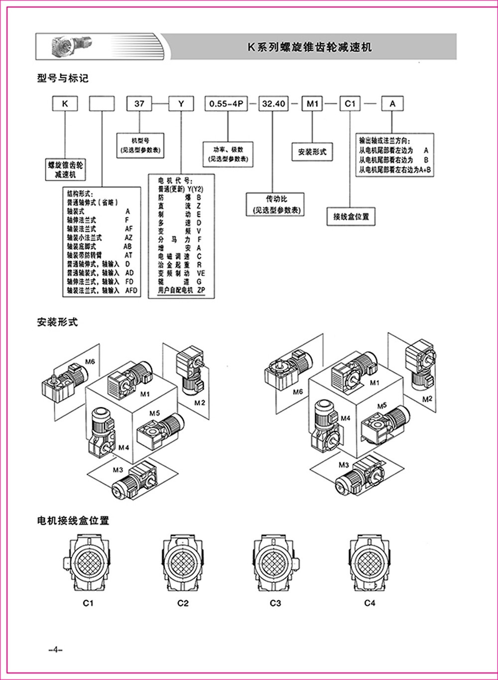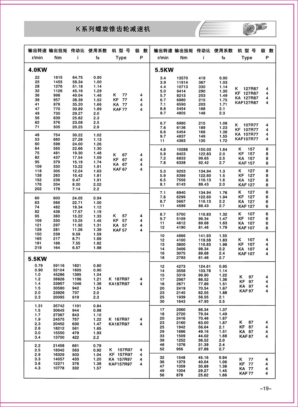 結(jié)構(gòu)形式:K-軸伸式、底腳安裝;KA-軸裝式聯(lián)接;KF-軸伸式、法蘭安裝;KAF-軸裝式、法蘭安裝;S-表示軸輸入。