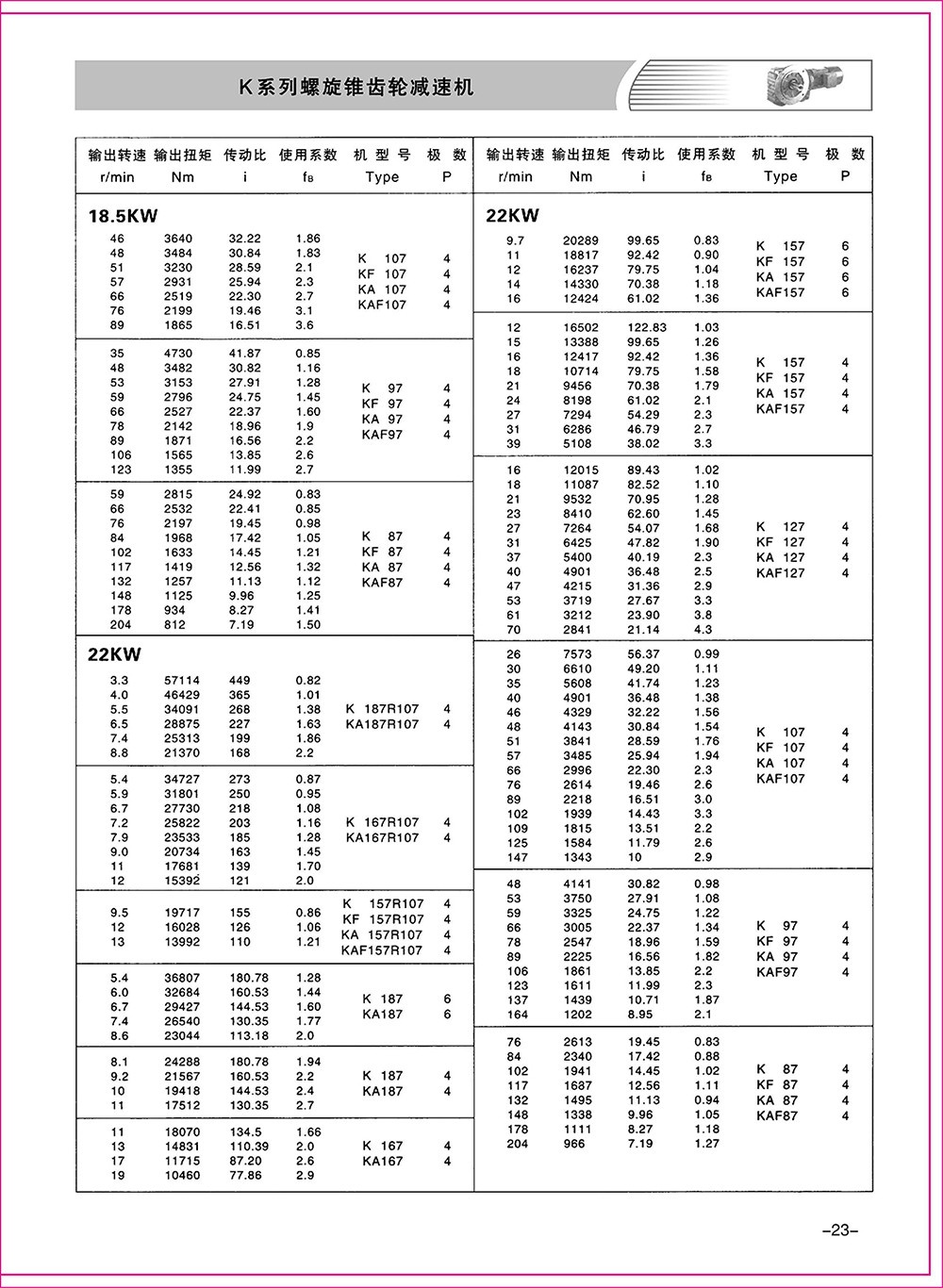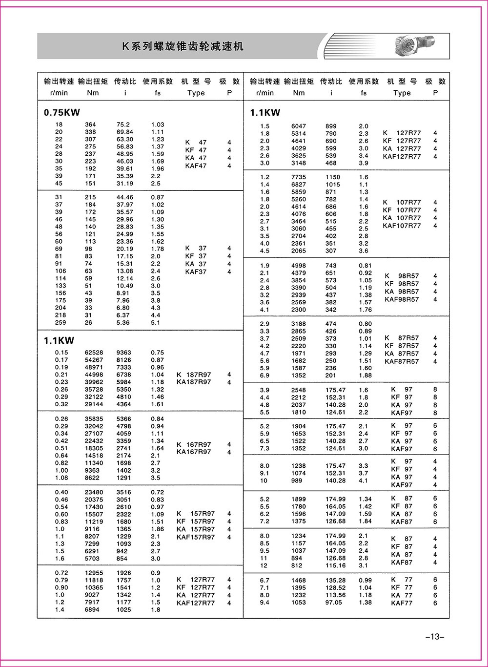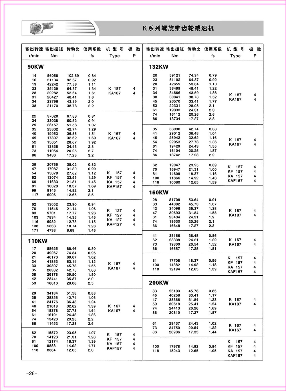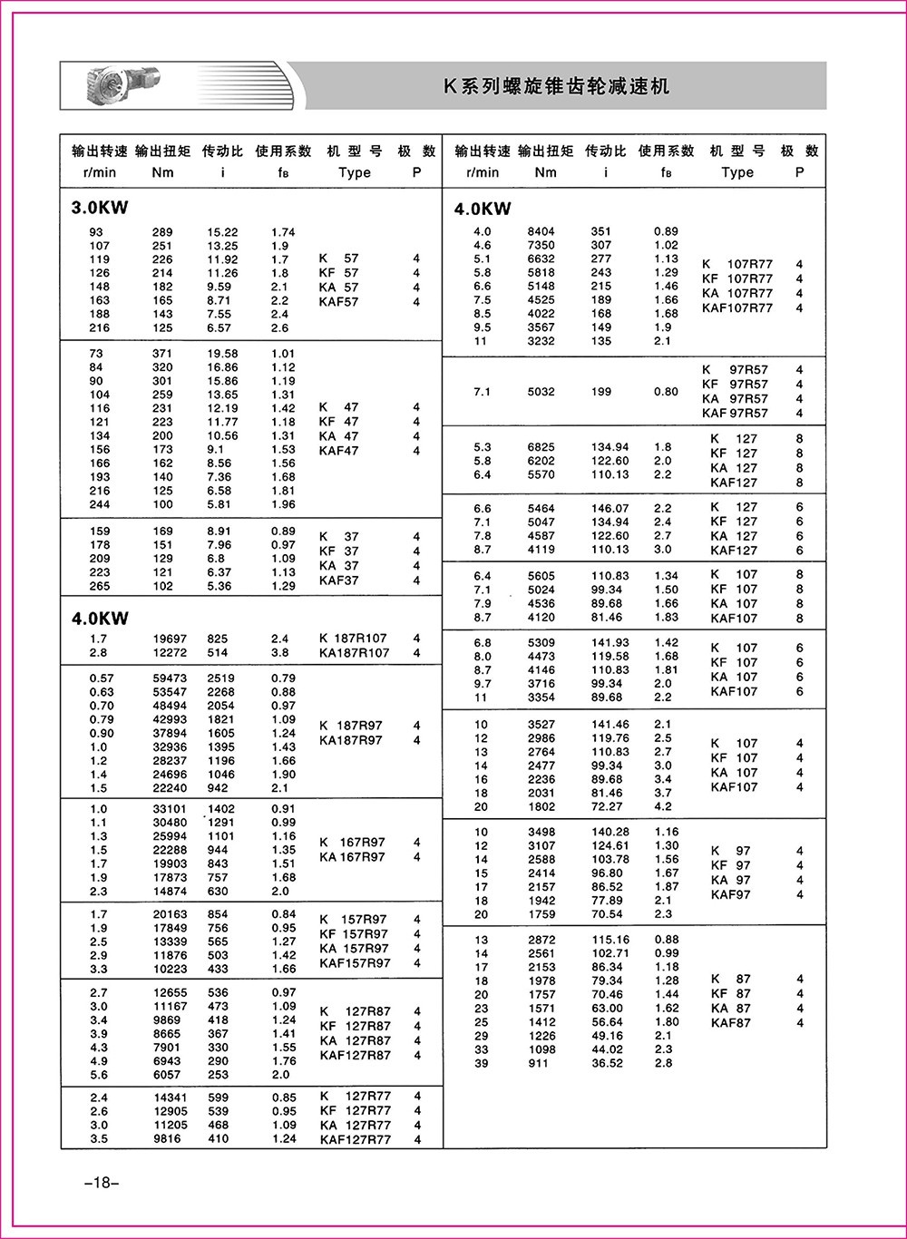 結(jié)構(gòu)形式:K-軸伸式、底腳安裝;KA-軸裝式聯(lián)接;KF-軸伸式、法蘭安裝;KAF-軸裝式、法蘭安裝;S-表示軸輸入。