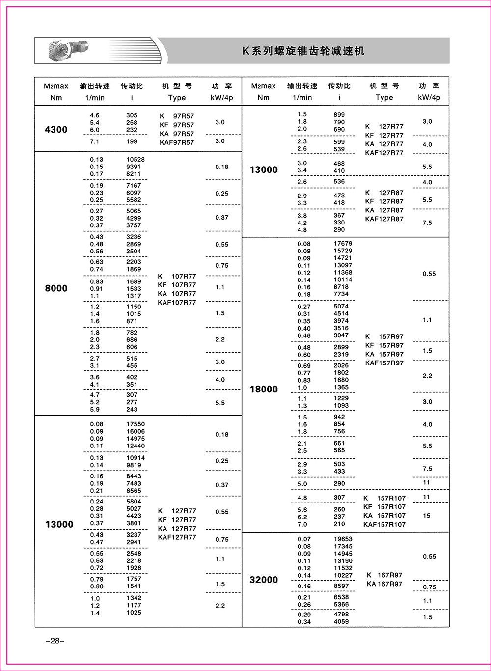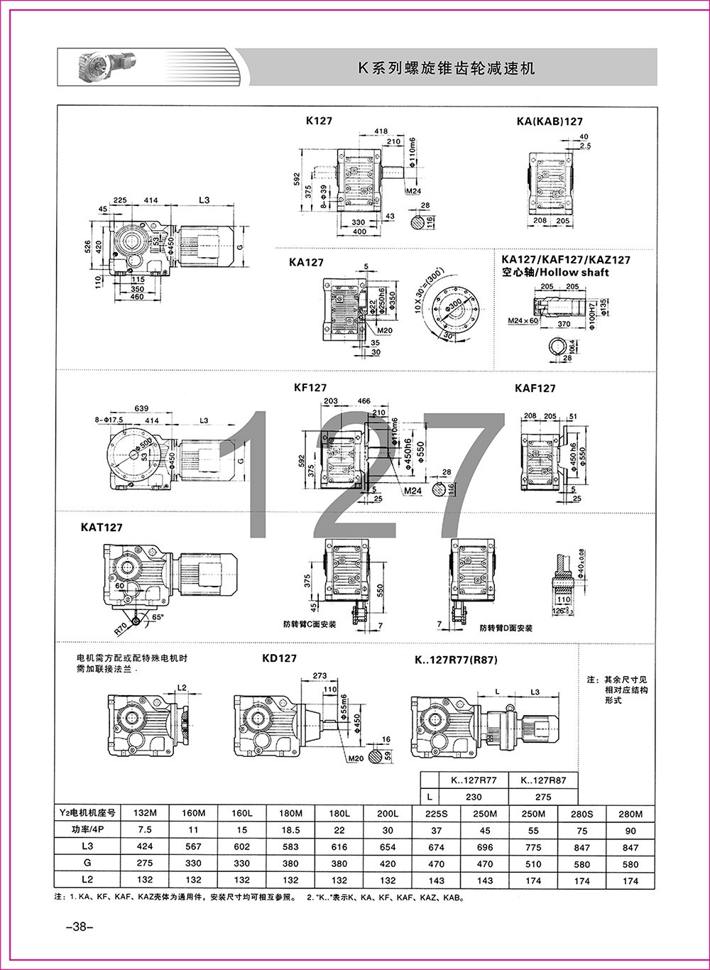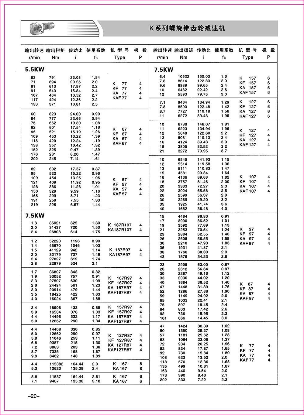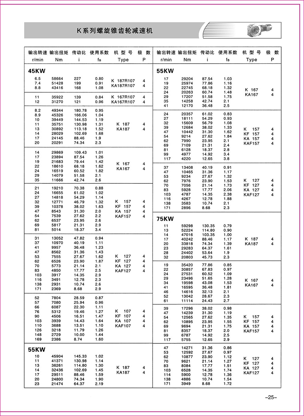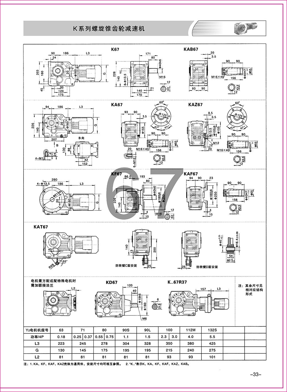 結(jié)構(gòu)形式:K-軸伸式、底腳安裝;KA-軸裝式聯(lián)接;KF-軸伸式、法蘭安裝;KAF-軸裝式、法蘭安裝;S-表示軸輸入。