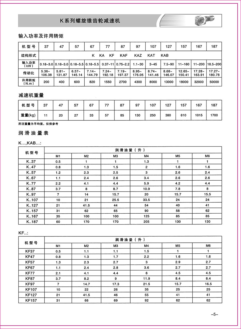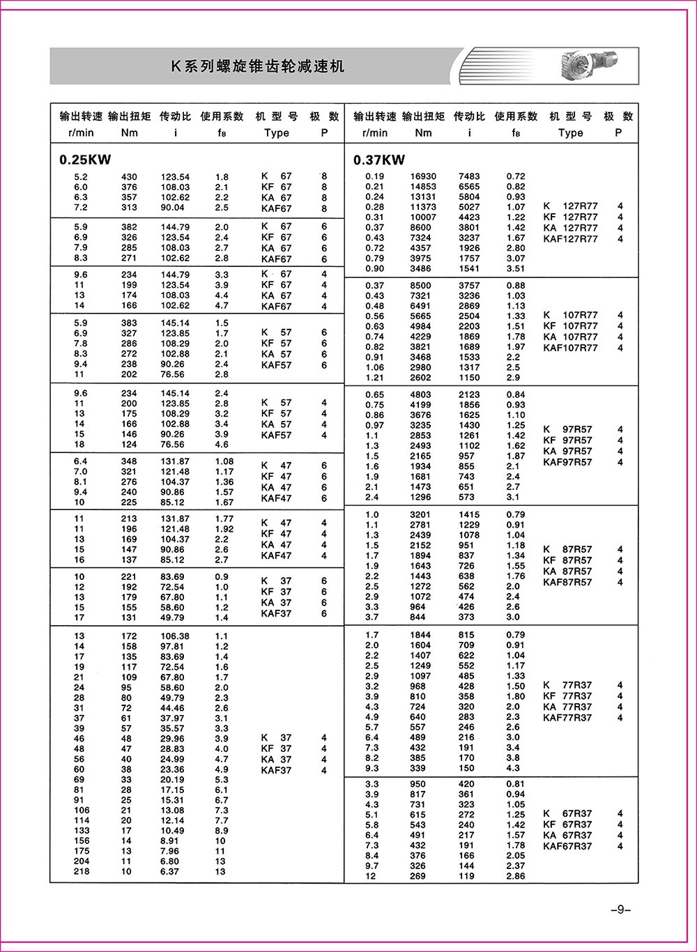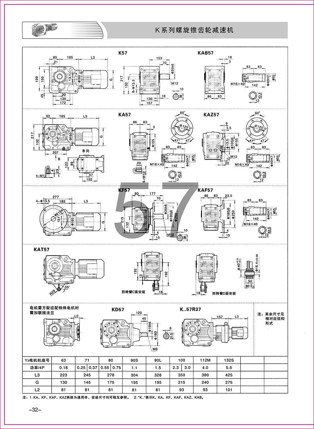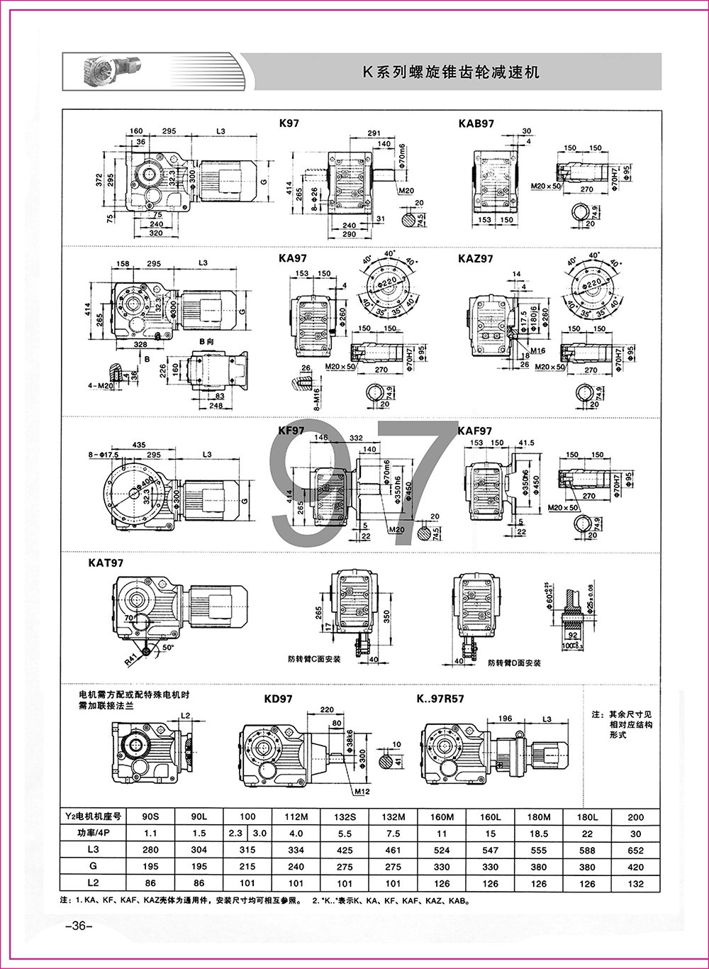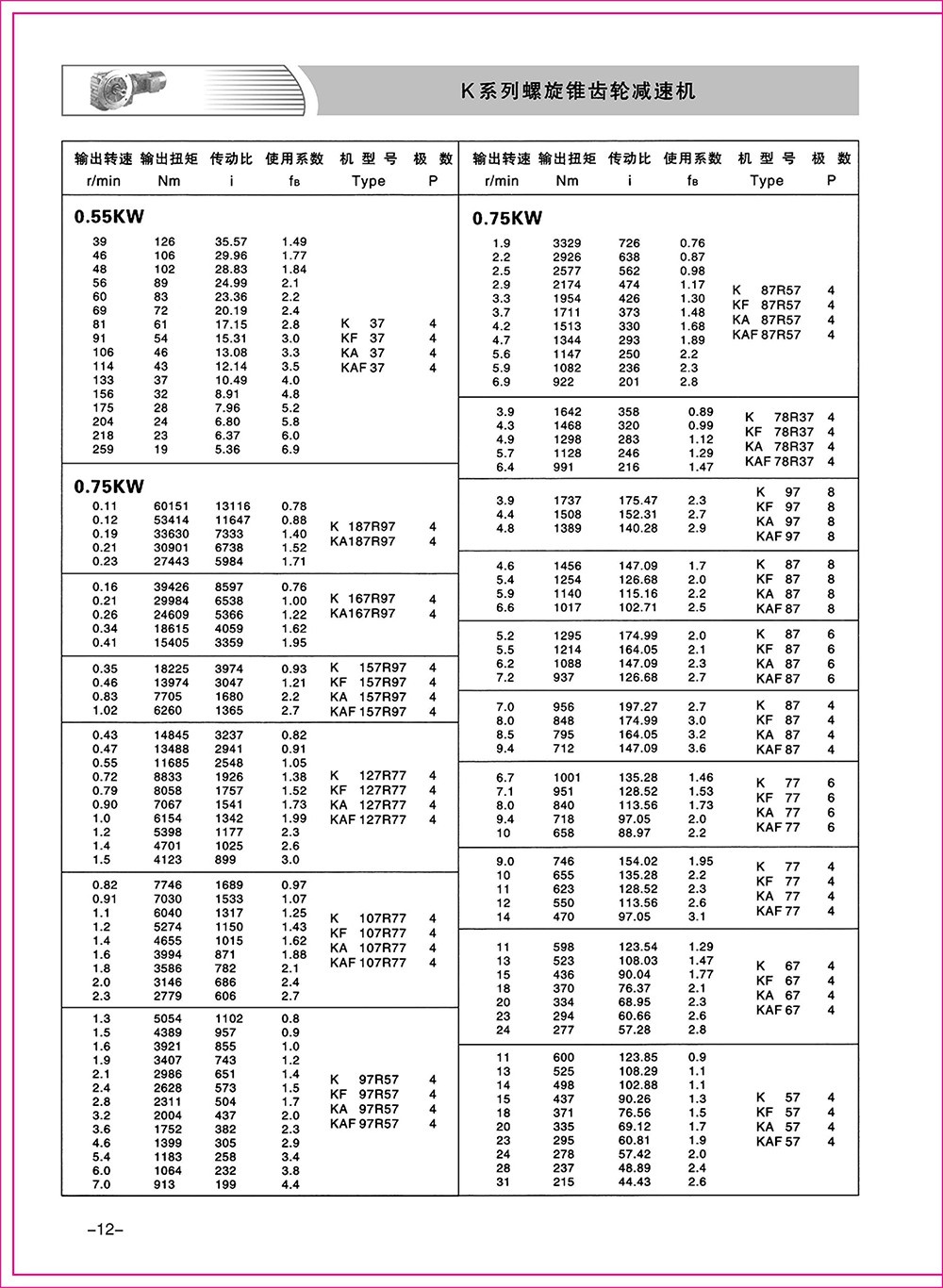 結(jié)構(gòu)形式:K-軸伸式、底腳安裝;KA-軸裝式聯(lián)接;KF-軸伸式、法蘭安裝;KAF-軸裝式、法蘭安裝;S-表示軸輸入。