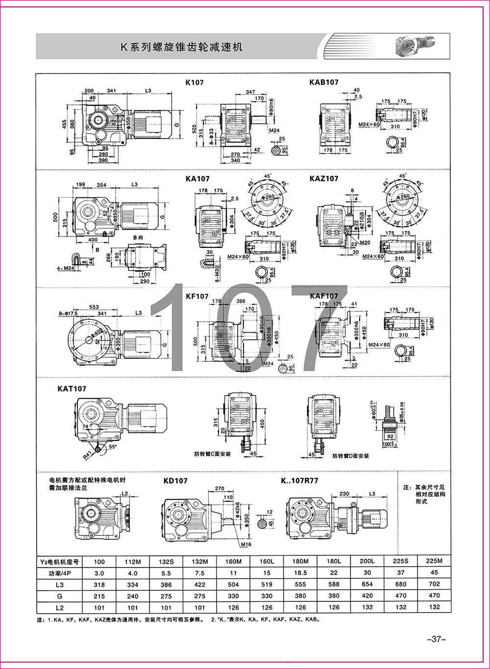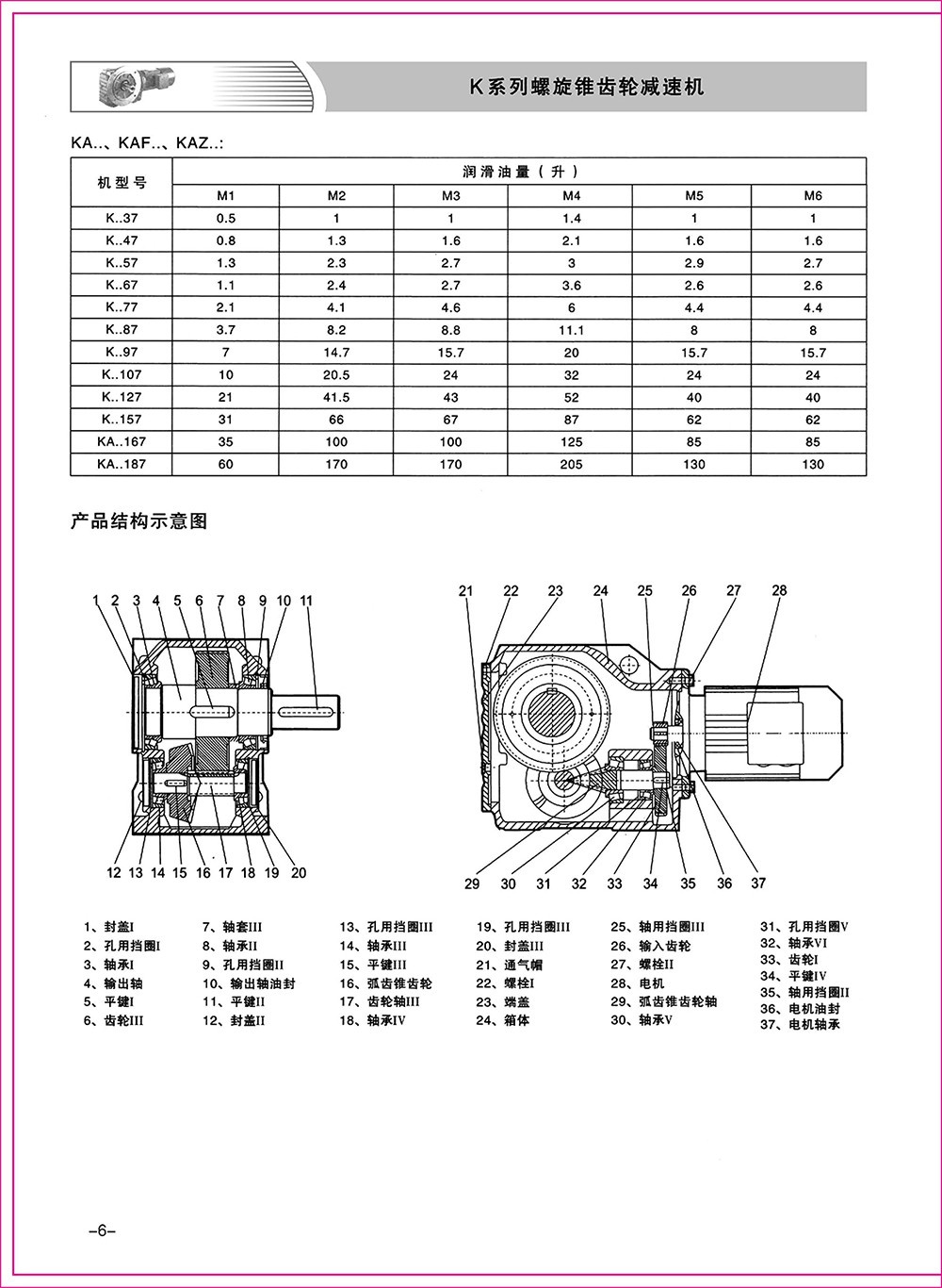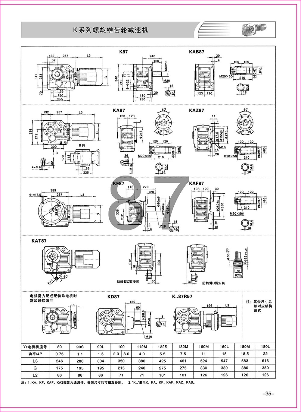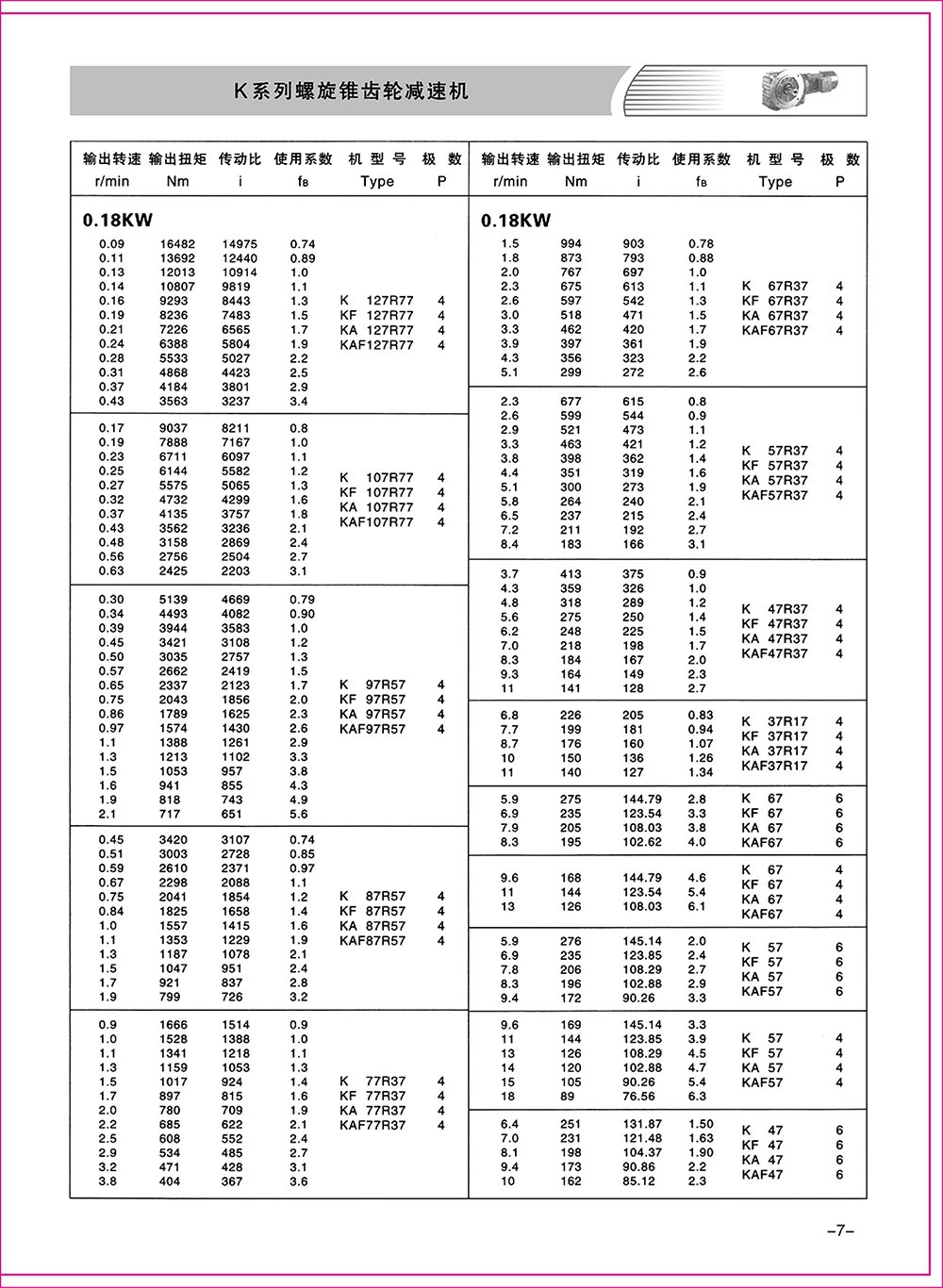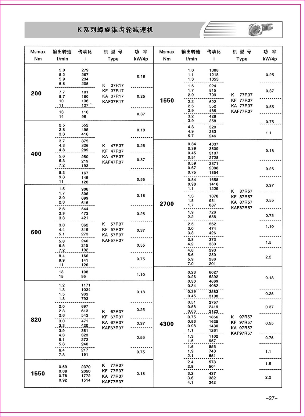結(jié)構(gòu)形式:K-軸伸式、底腳安裝;KA-軸裝式聯(lián)接;KF-軸伸式、法蘭安裝;KAF-軸裝式、法蘭安裝;S-表示軸輸入。