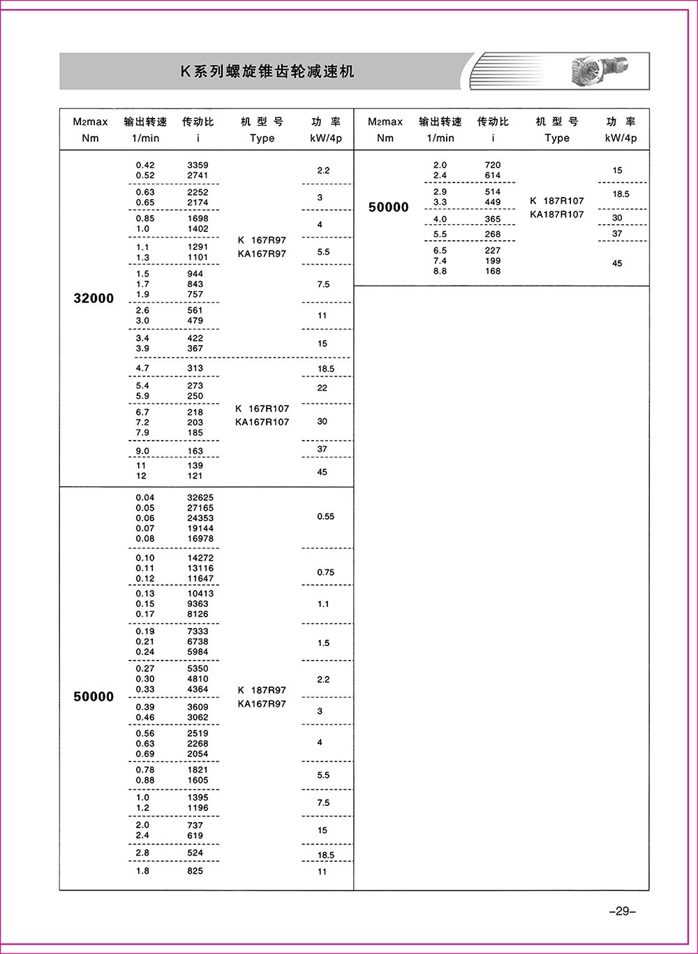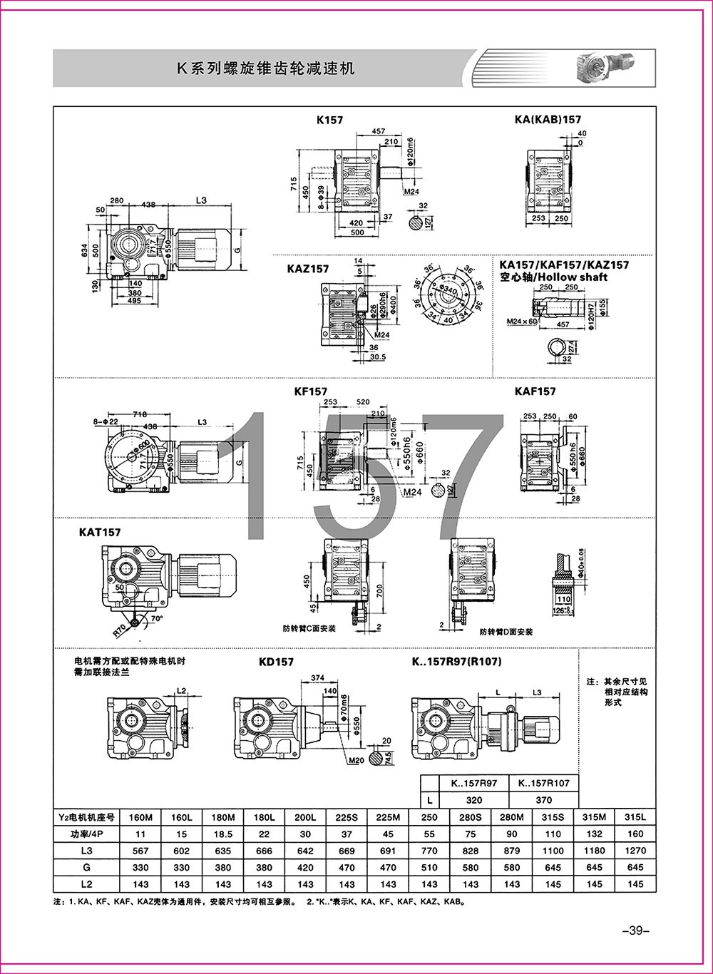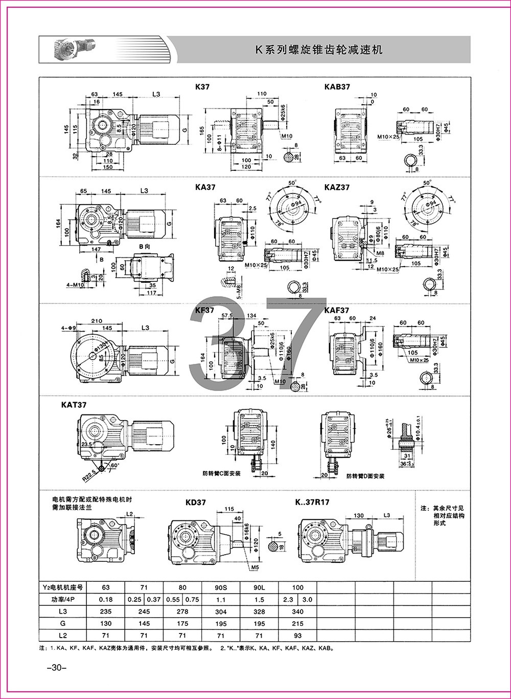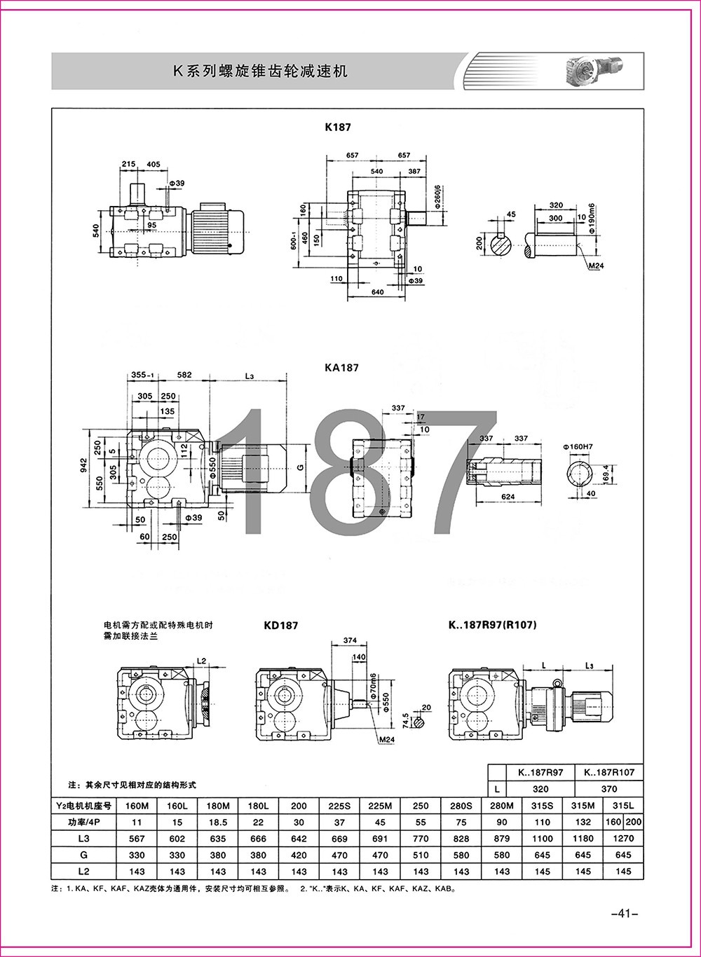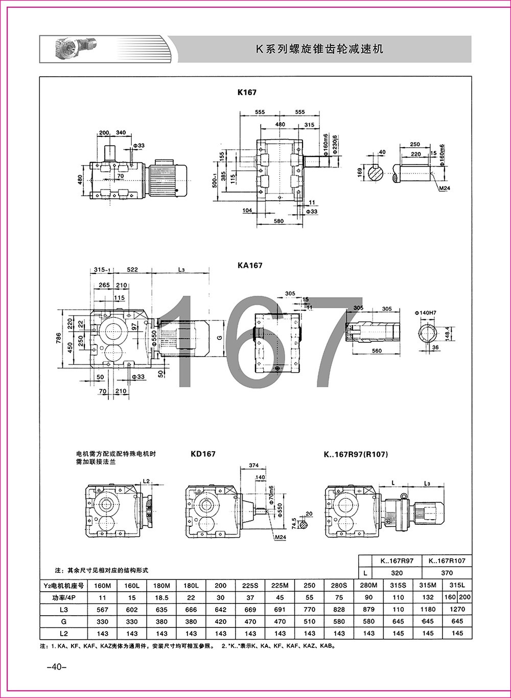 結(jié)構(gòu)形式:K-軸伸式、底腳安裝;KA-軸裝式聯(lián)接;KF-軸伸式、法蘭安裝;KAF-軸裝式、法蘭安裝;S-表示軸輸入。